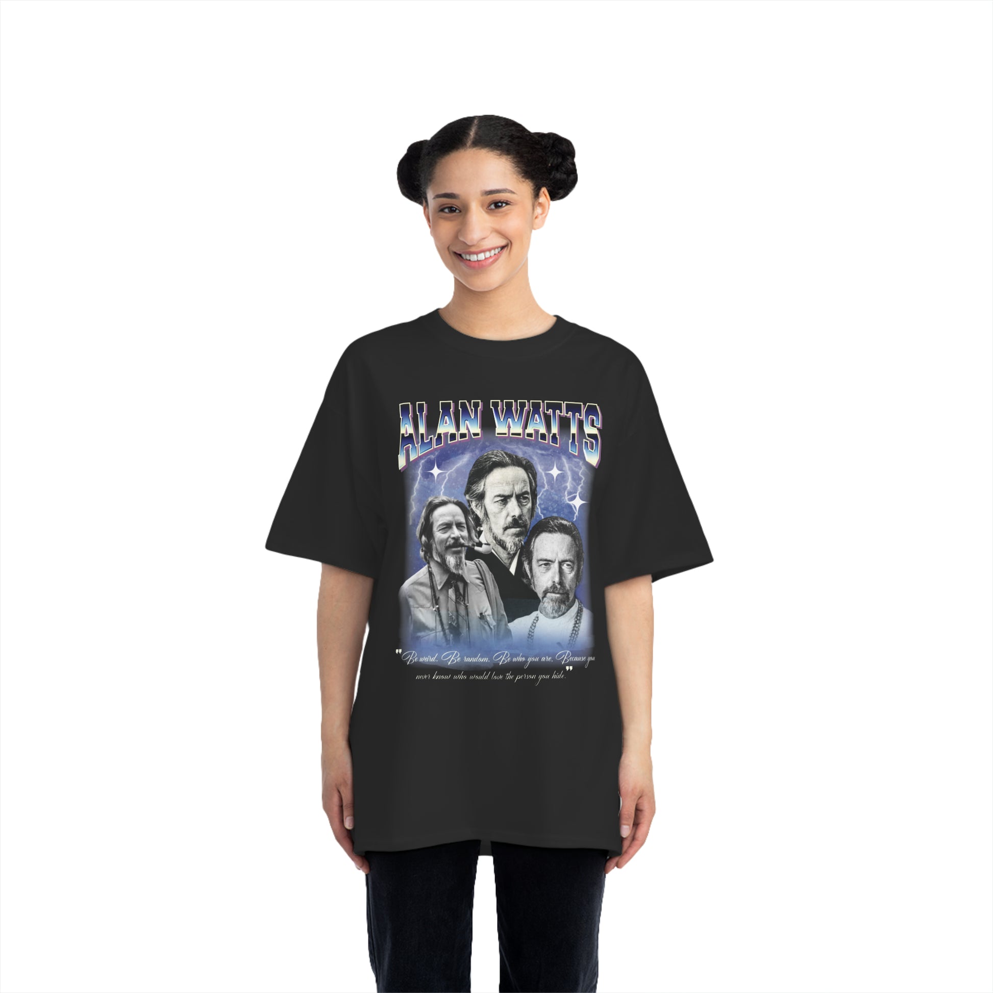 Alan Wilson Watts (6 January 1915 – 16 November 1973) was an English writer, speaker and self-styled "philosophical entertainer",[2] known for interpreting and popularising Japanese, Chinese and Indian traditions of Buddhist, Taoist, and Hindu philosophy for a Western audience. Born in Chislehurst, England, he moved to the United States in 1938 and began Zen training in New York. He received a master's degree in theology from Seabury-Western Theological Seminary and became an Episcopal priest in 1945. He left the ministry in 1950 and moved to California, where he joined the faculty of the American Academy of Asian Studies.[3] - Wikipedia.: 100% cotton jersey (fiber content may vary for different colors)