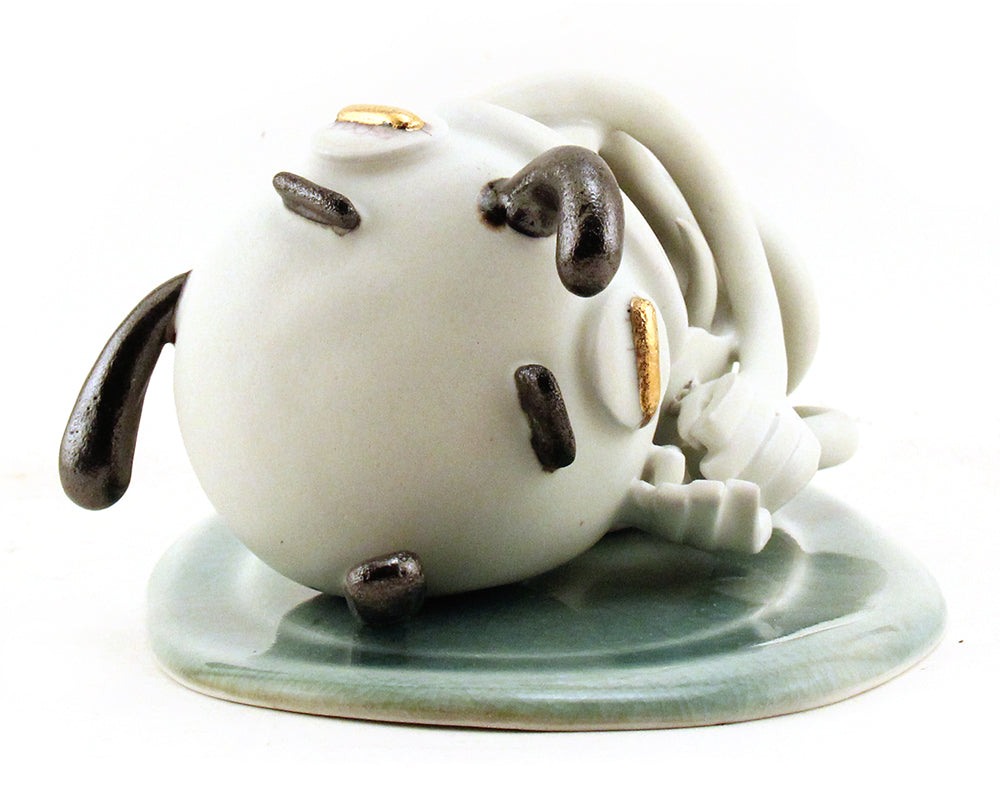 Bank is made with Babu porcelain. The main pieces are wheel thrown then added on top with details. Once sculpting is finished, the piece is slowly dried and then fired for the first time. It is then glazed and fired once more for the piece to reach its fully vitrified state. Selective details are then adorned with precious 22 karat gold and luster fired.