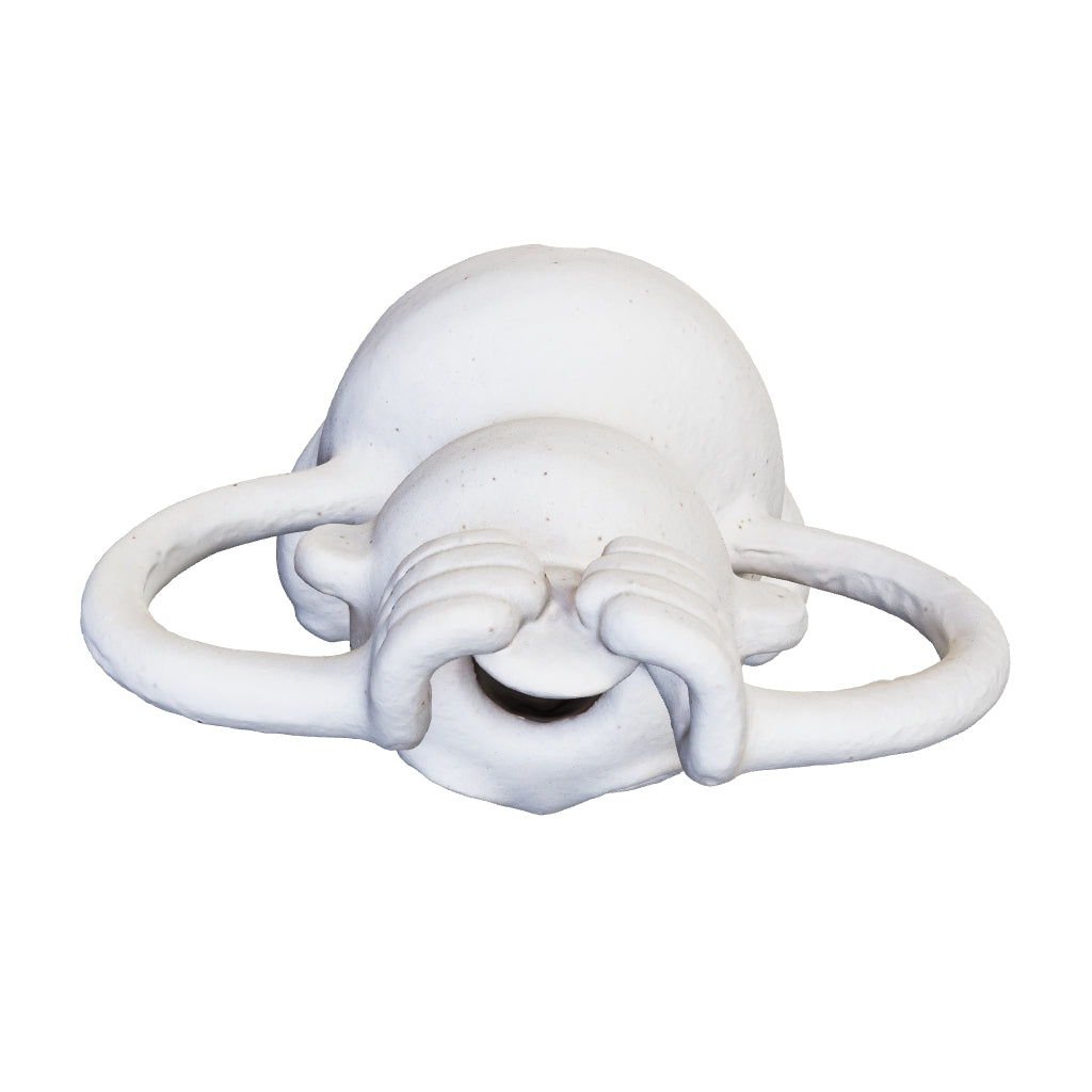Guts is made with Sonora White Clay. The main pieces are wheel thrown then added on top with details. Once sculpting is finished, the piece is slowly dried and then fired for the first time. It is then glazed and fired once more for the piece to reach its fully vitrified state. Selective details are then adorned with precious 22 karat gold and luster fired.