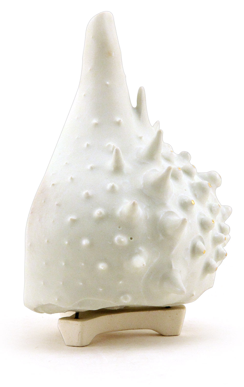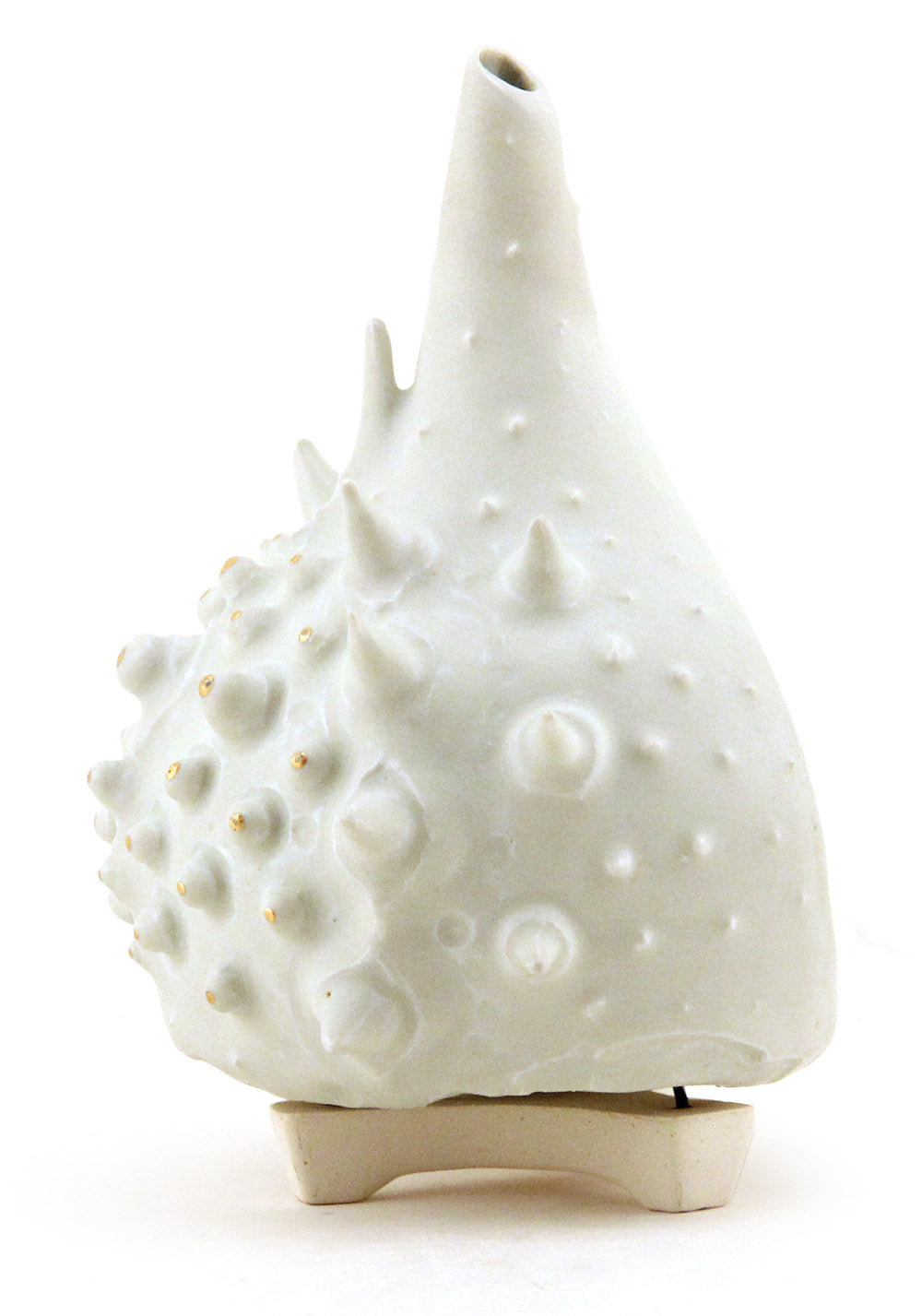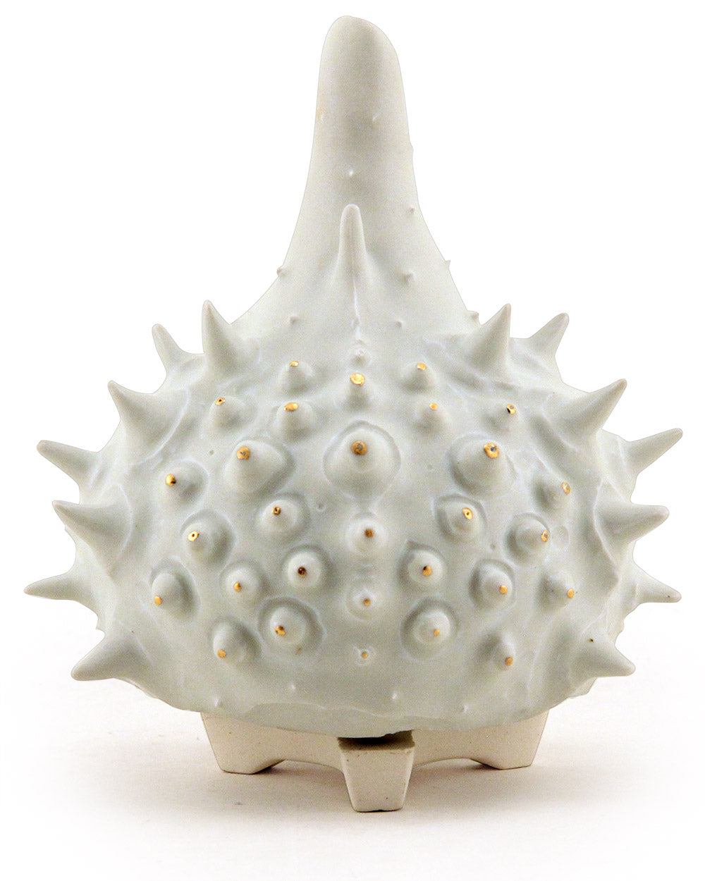 Hearth is made with Babu high-fire porcelain. The main pieces are wheel thrown then added on top with details. Once sculpting is finished, the piece is slowly dried and then fired for the first time. It is then glazed and fired once more for the piece to reach its fully vitrified state. Selective details are then adorned with precious 22 karat gold and luster fired.