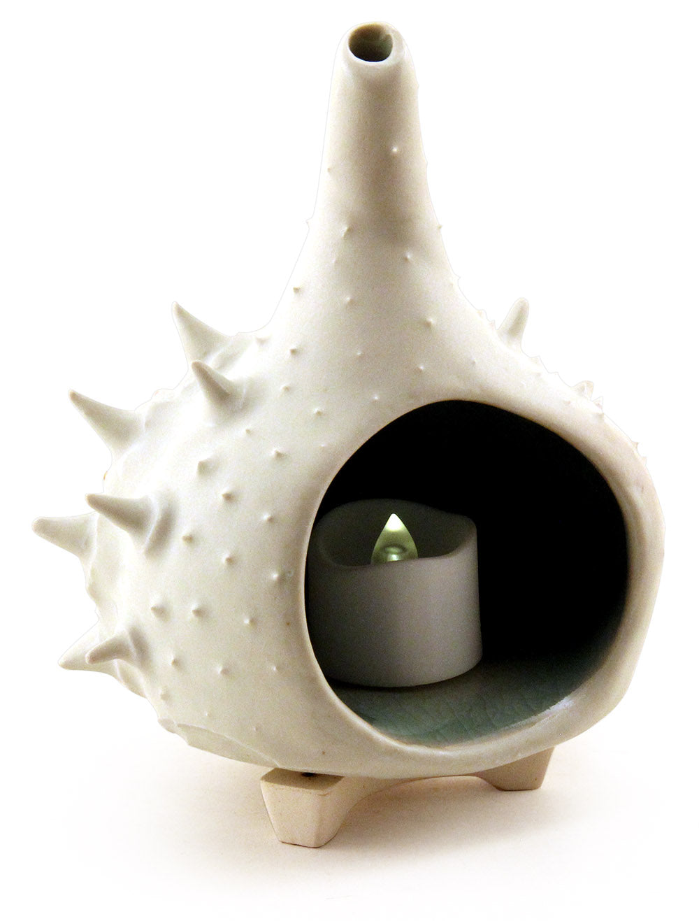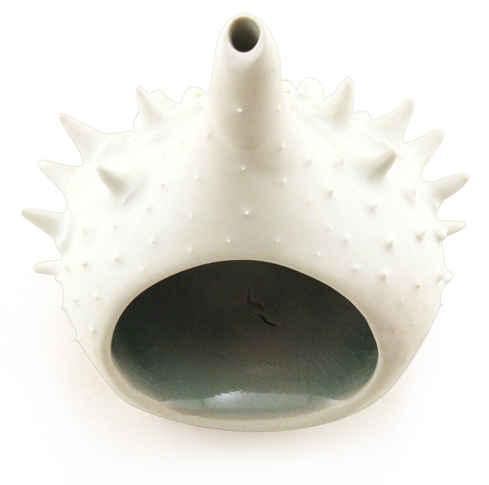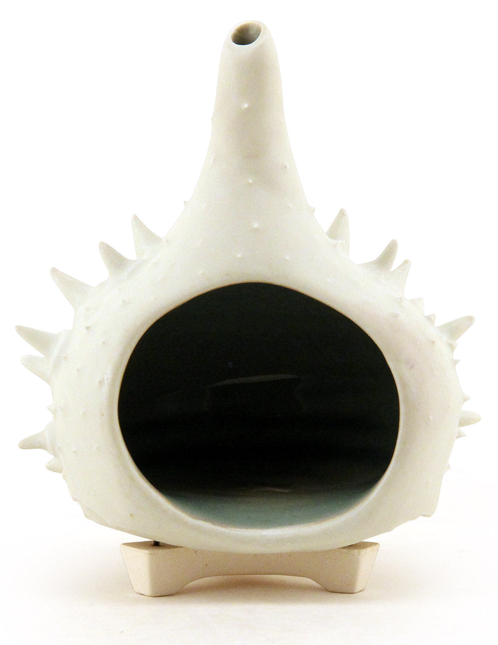 Hearth is made with Babu high-fire porcelain. The main pieces are wheel thrown then added on top with details. Once sculpting is finished, the piece is slowly dried and then fired for the first time. It is then glazed and fired once more for the piece to reach its fully vitrified state. Selective details are then adorned with precious 22 karat gold and luster fired.
