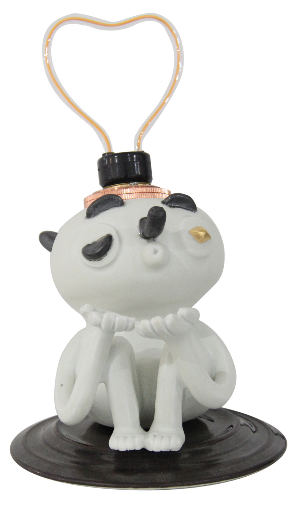 Gemini is sculpted with Babu porcelain and high-fired in a gas kiln. Once fired, the piece is glazed and fired twice more. Selective details are adorned in precious 22 karat gold. One twin did not survive the initial firing (and is not displayed), the remaining one serves to greet and wish well those along the path of reunion.