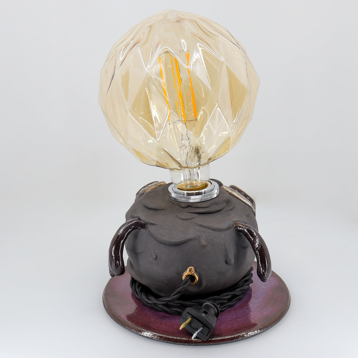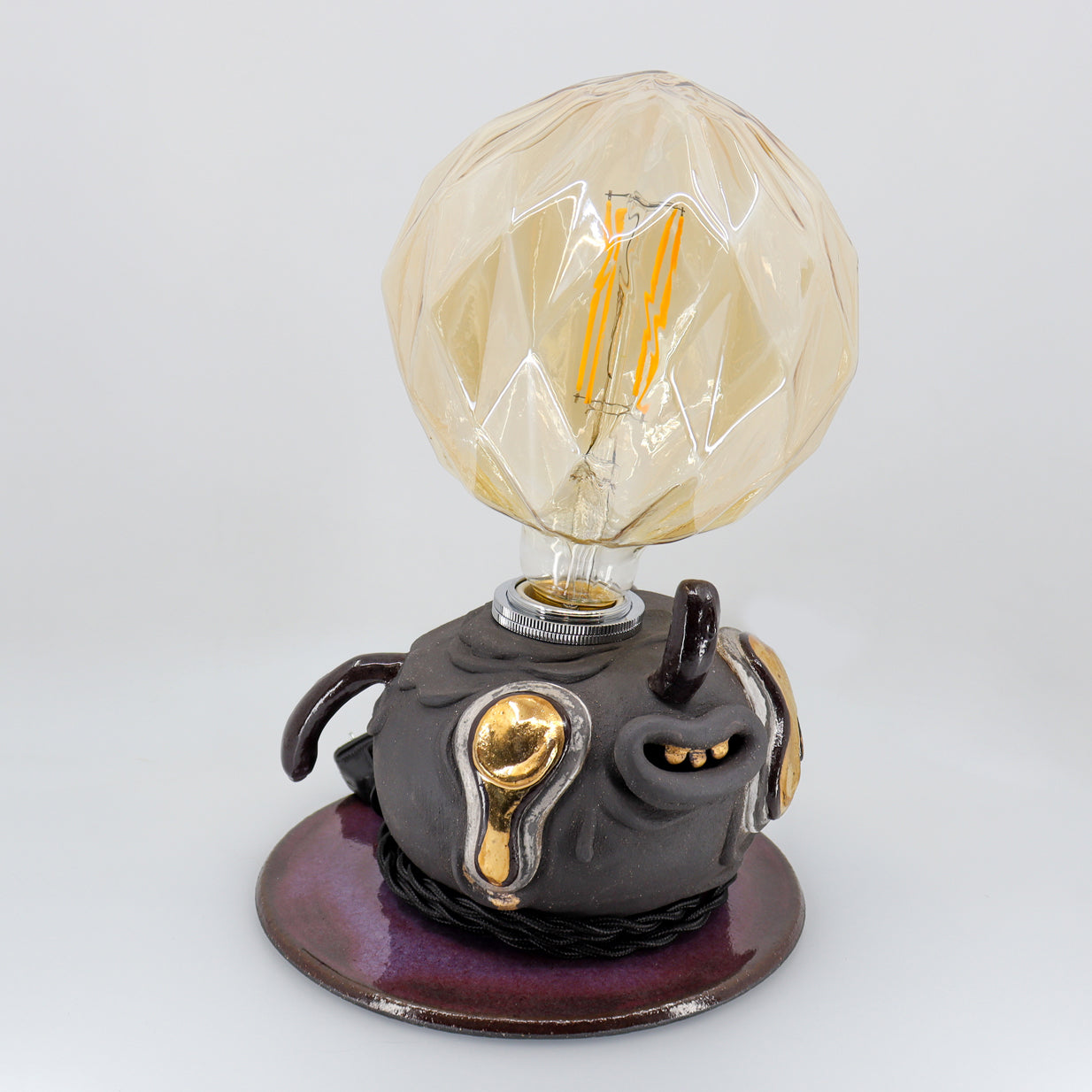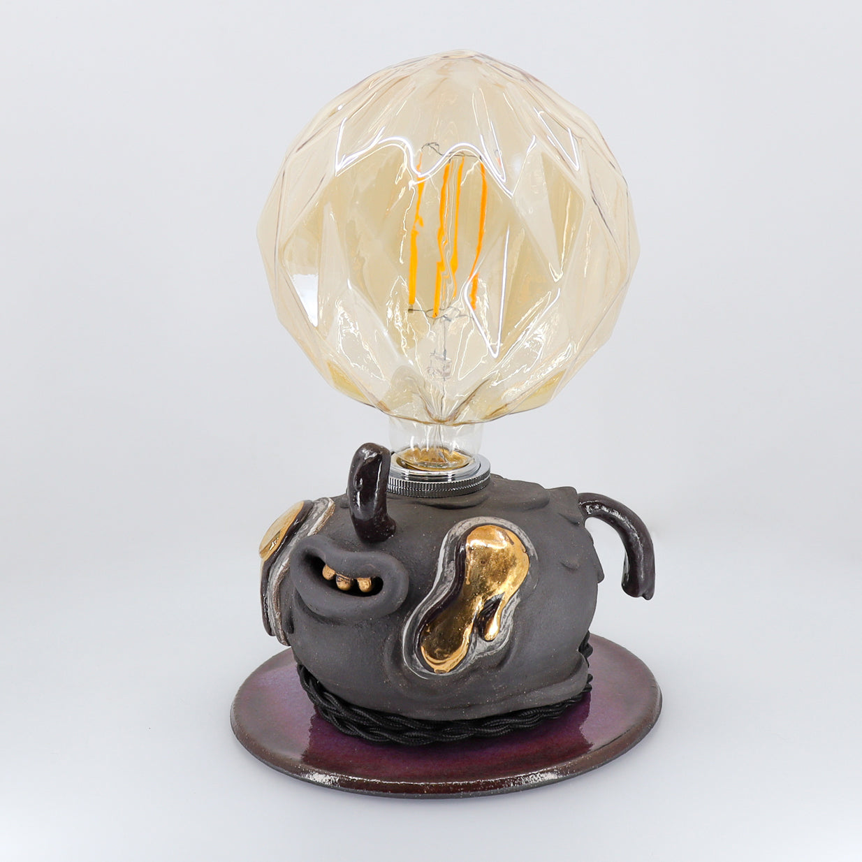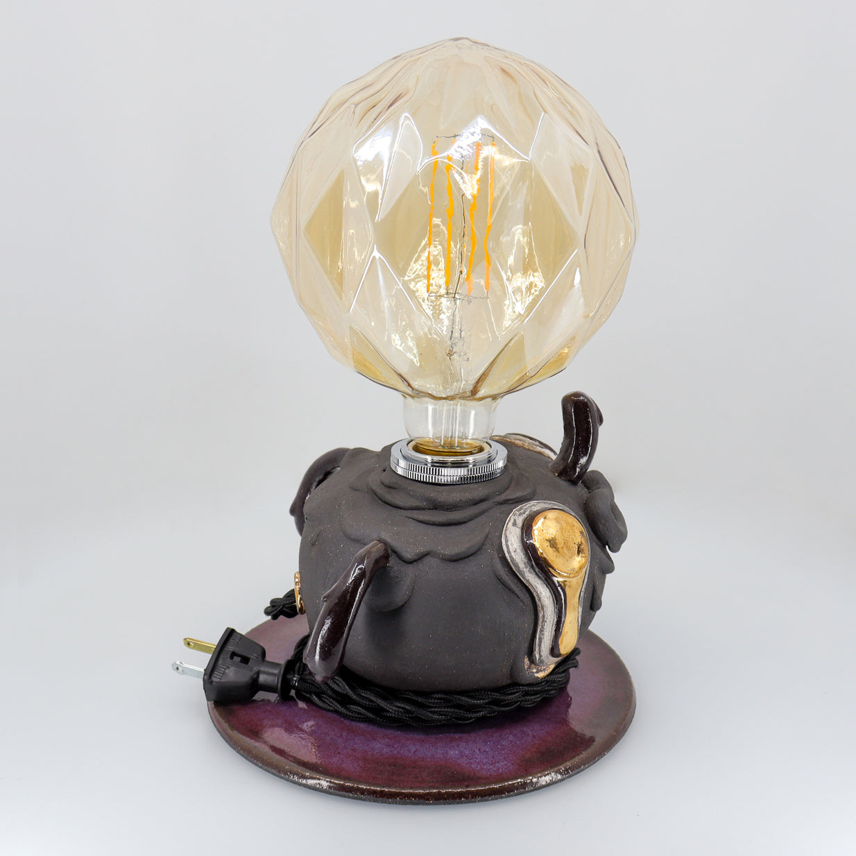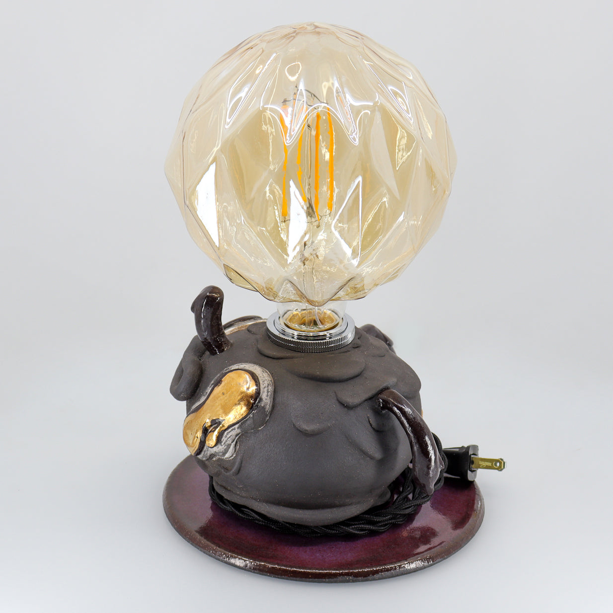 Night is made with high-fire stoneware. The main vessel pieces are wheel-thrown then sculpted with details on top. Once sculpting is finished, the piece is slowly dried and then fired for the first time. It is then glazed and fired once more for the piece to reach its fully vitrified state. Chosen details are then adorned with precious 22 karat gold and luster fired. The electrical cord is then threaded through, wired and assembled.
