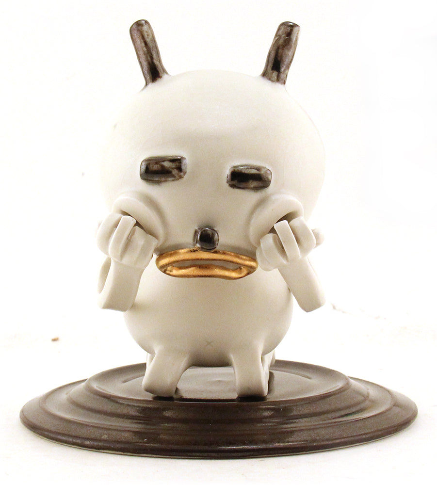 Release is made with high-fire porcelain. The main vessel pieces are wheel-thrown then sculpted with details on top. Once sculpting is finished, the piece is slowly dried and then fired for the first time. It is then glazed and fired once more for the piece to reach its fully vitrified state. Chosen details are then adorned with precious 22 karat gold and luster fired. If a lamp, electrical is then threaded through and assembled.