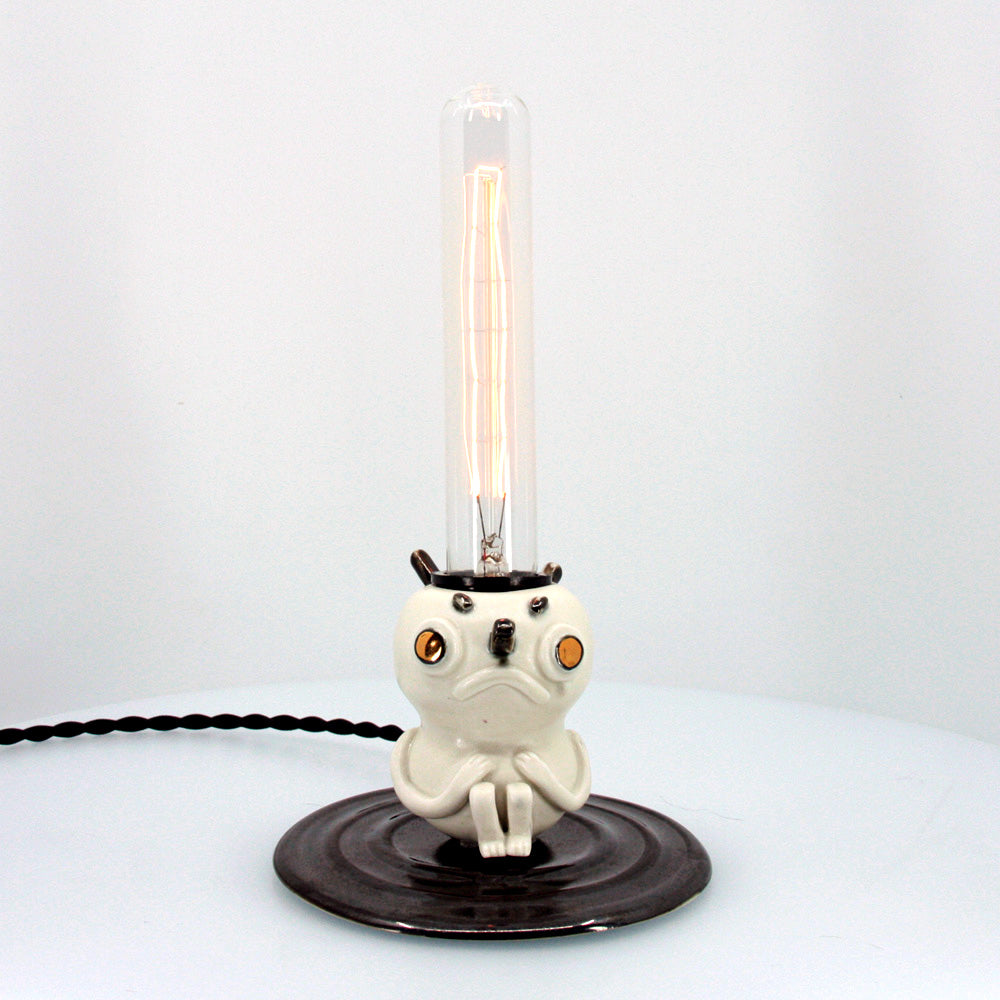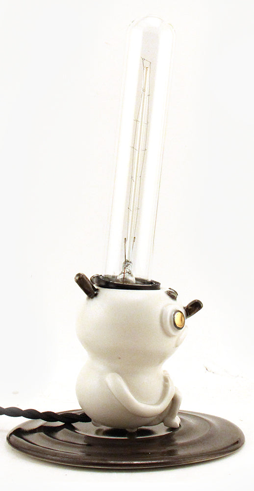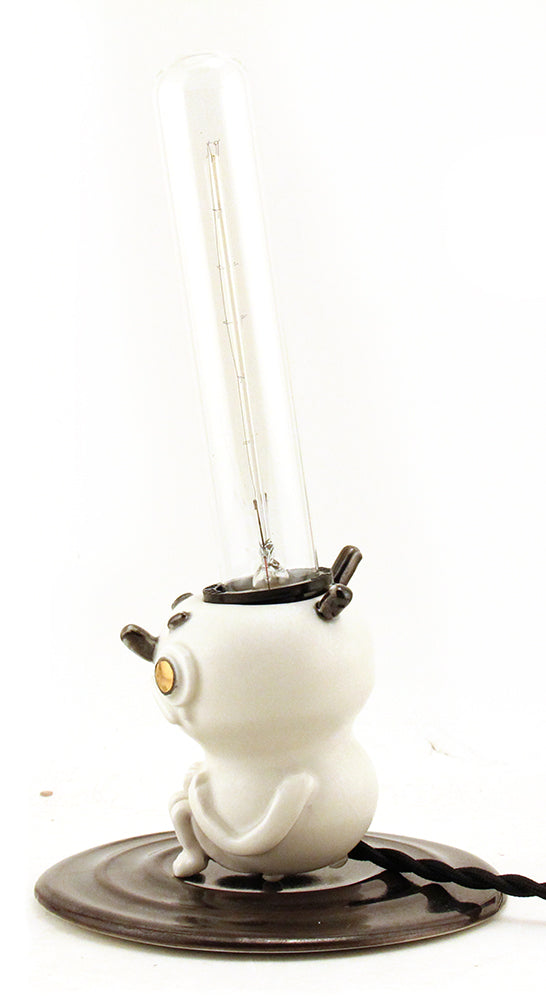 Separation is made with high-fire porcelain. The main vessel pieces are wheel-thrown then sculpted with details on top. Once sculpting is finished, the piece is slowly dried and then fired for the first time. It is then glazed and fired once more for the piece to reach its fully vitrified state. Chosen details are then adorned with precious 22 karat gold and luster fired. If a lamp, electrical is then threaded through and assembled.